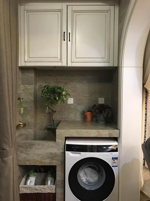 建议想做整体柜的可以做个谷仓门的洗衣柜,或者是普通移门也行,只是谷仓门更加有美感,造价也不贵。推开就可以洗衣,杂物也可以摆放更加整齐,而且谷仓门超级有气质的。
