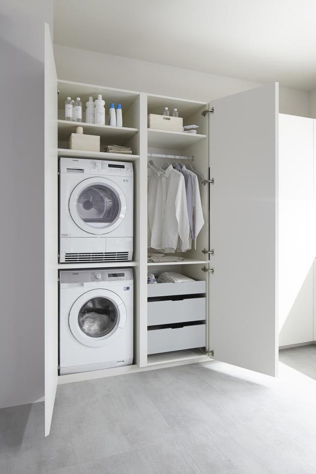 通墙柜和置物架组合特别节省空间,而且很适合洗衣机+干衣机组合。洗衣机+干衣机组合一般都占据了大半个墙面,干脆做个顶天立地的通墙柜,上层正好可以放置洗衣用品。