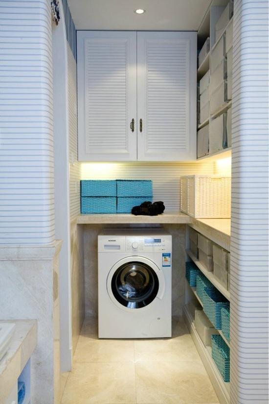 生活阳台的放置杂物功能也是需要考虑的一部分,想要好看又实用并不必须打造那么多封闭式的柜子,洗衣柜也可以是三搁板的组合。