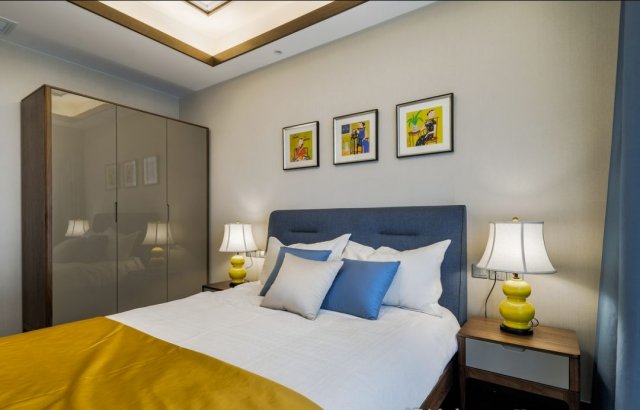 整体色调以米色和咖色做为基调,软装用冷暖亮色撞色,去掉以往的沉重,整体空间温馨舒适。